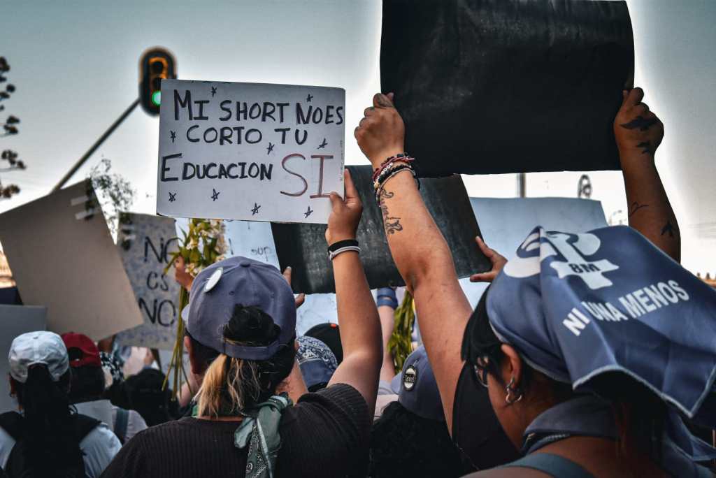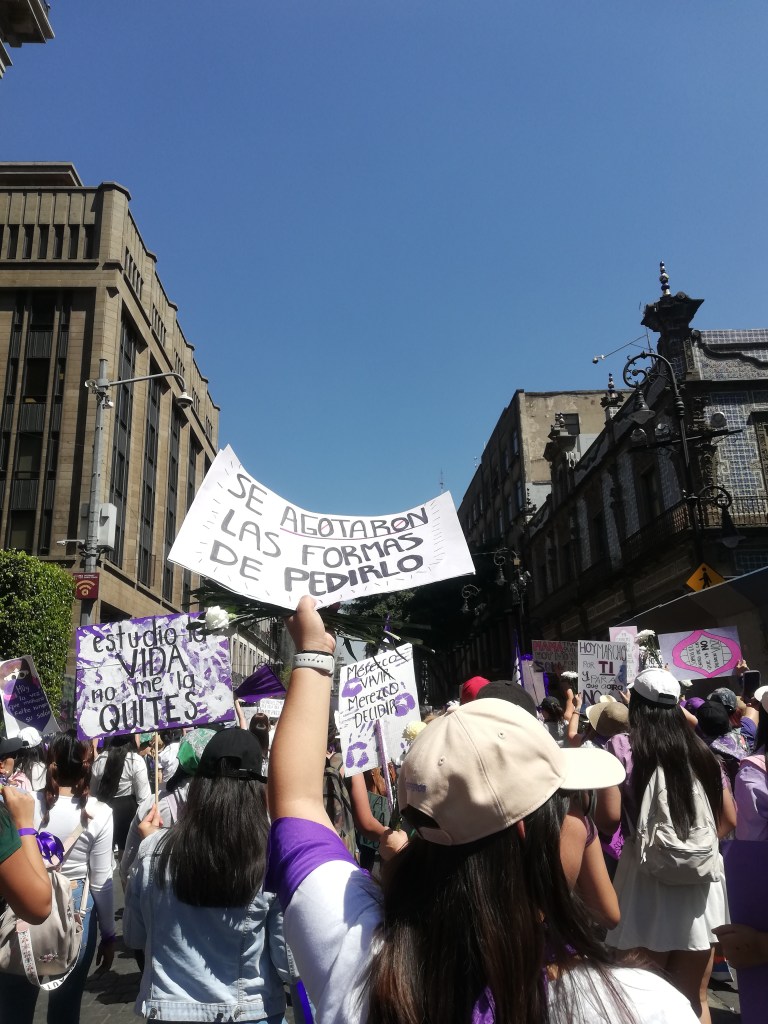 En cada punto de reunión se preparaban para salir a la calle. Desde el Monumento a la Madre se podían observar cientos de mujeres elaborando carteles, cargando flores, esperando amigas, dejando fotografías en un tendedero de personas desaparecidas y con paliacates verdes y morados, vendedoras ambulantes se hicieron presentes apoyando y vendiendo artículos significativos de la lucha feminista.